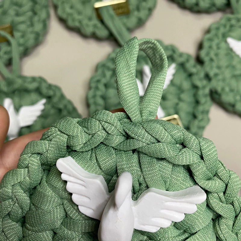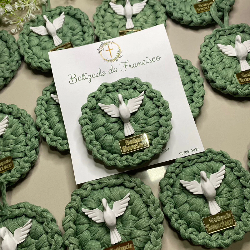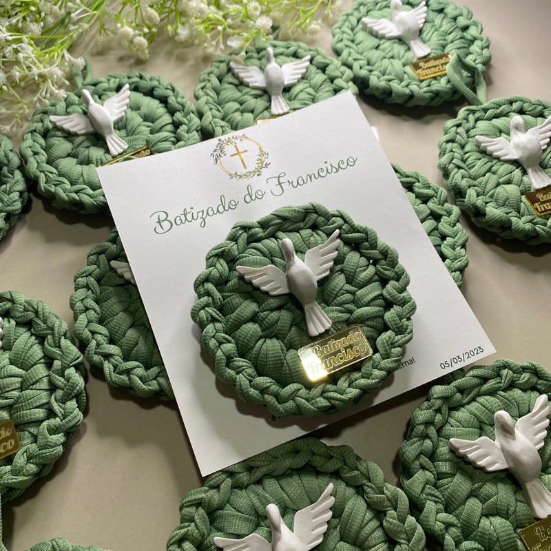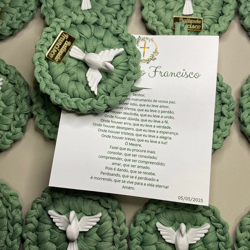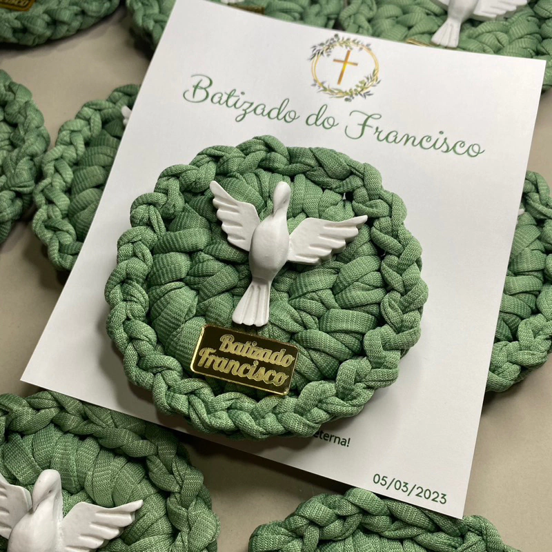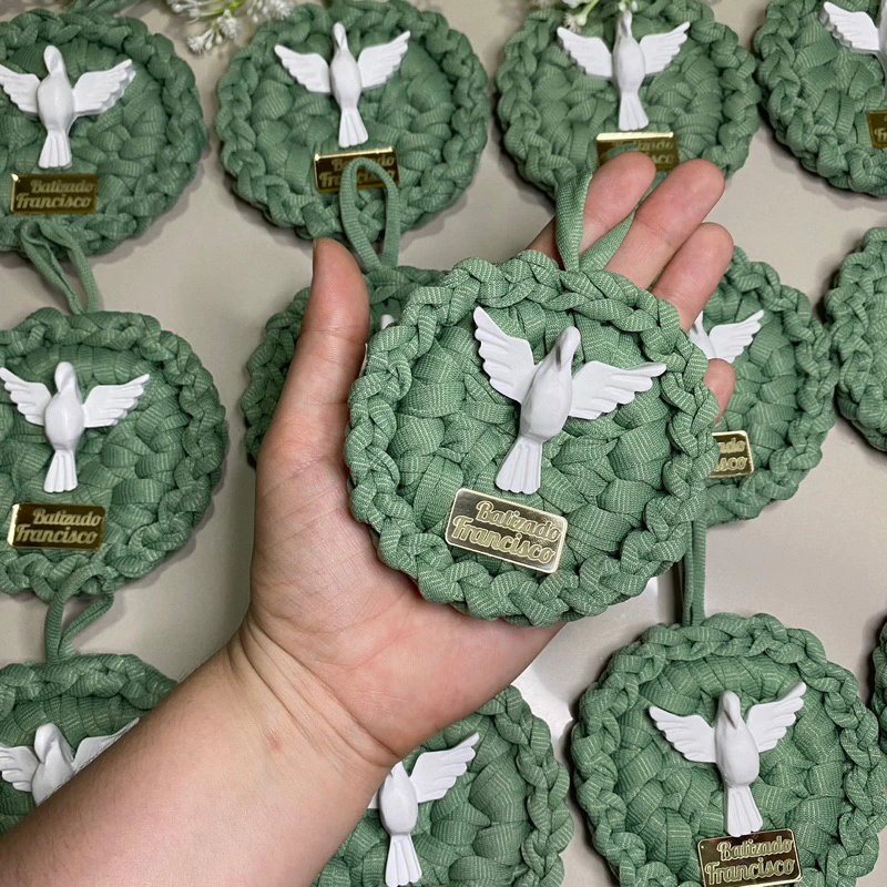 Produto 100% artesanal , feito em Crochê , com plaquinha personalizada no acrílico Dourado e Tag Personalizada com Oração.