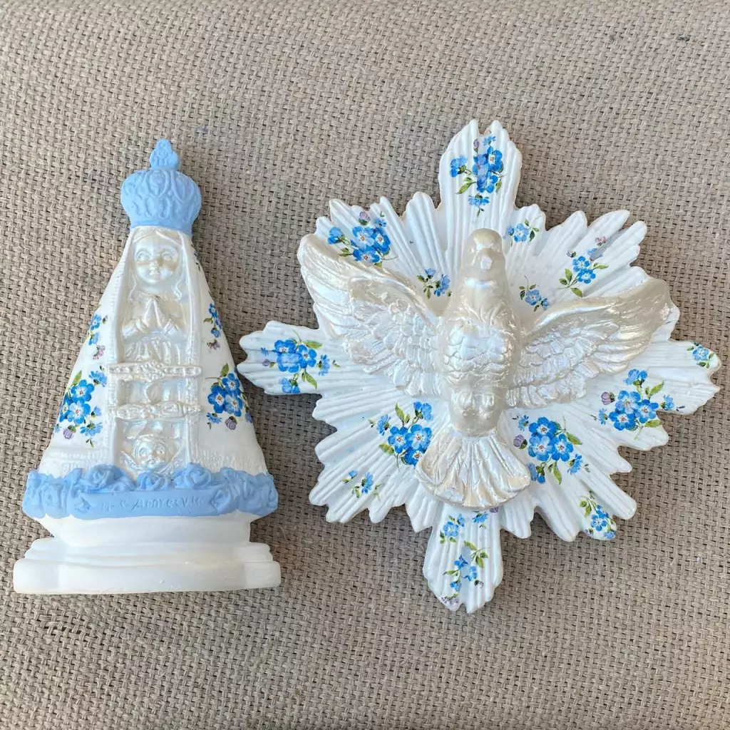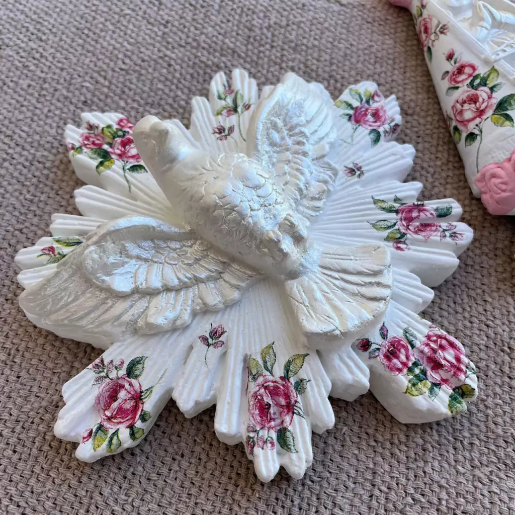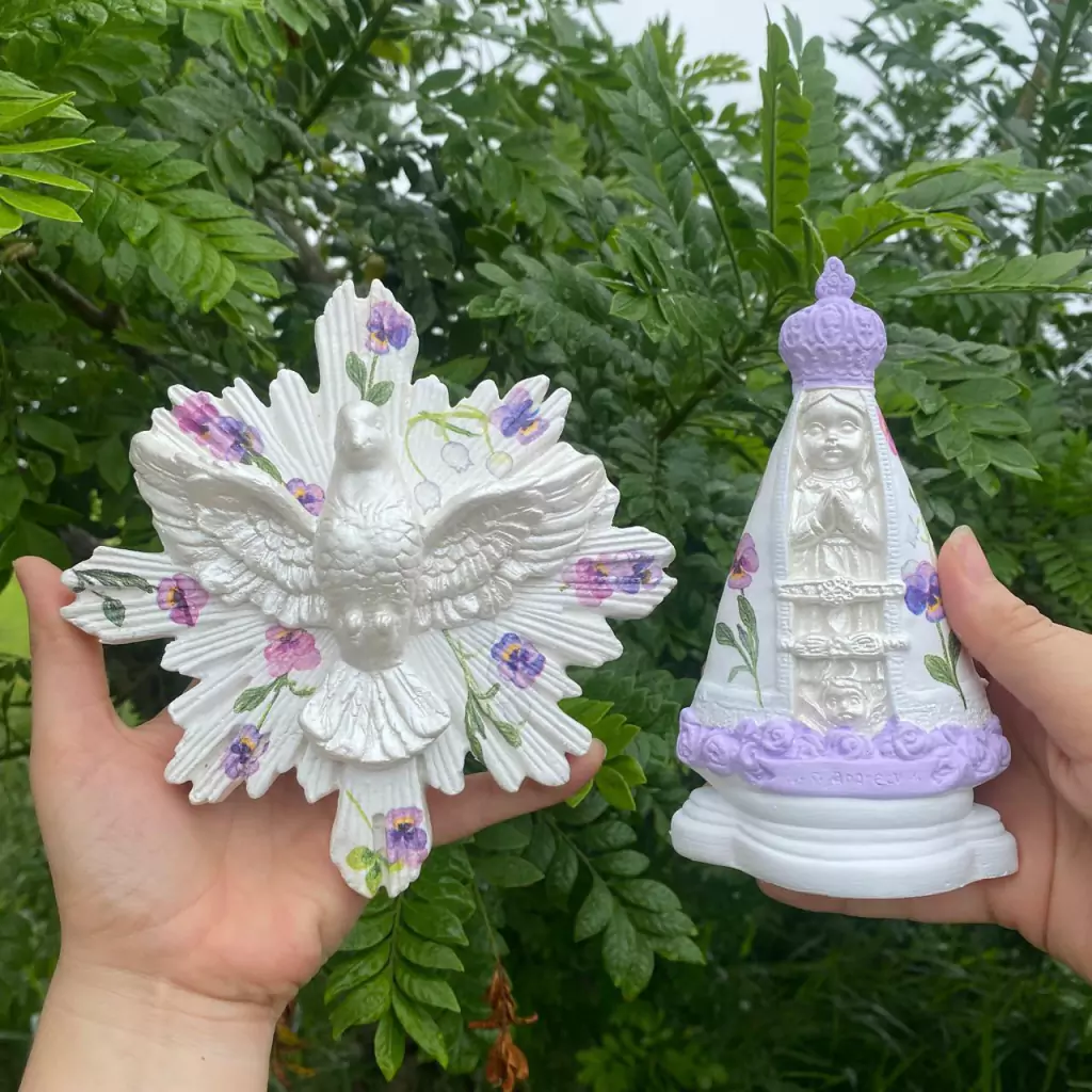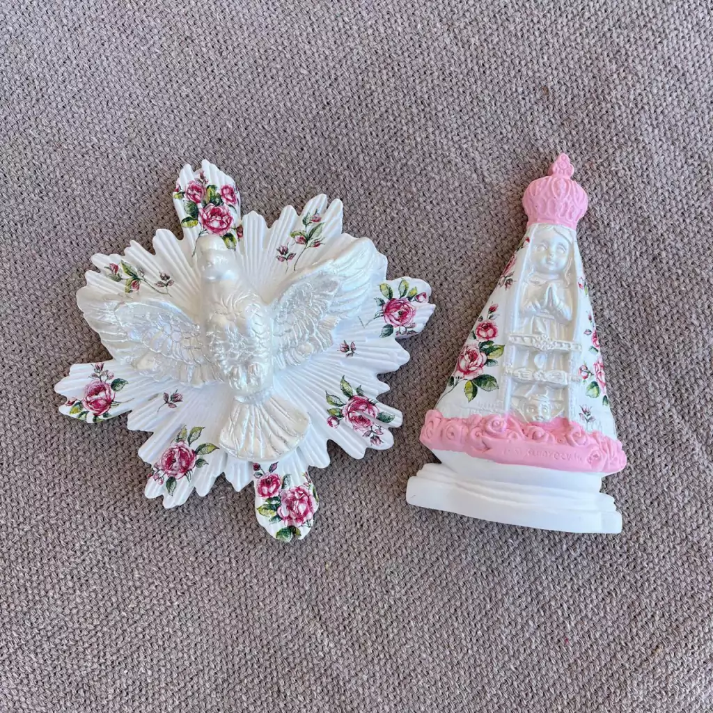 01 Divino Espírito Santo 17cm gesso decorado com Decoupage Rosa e detalhe perolado.