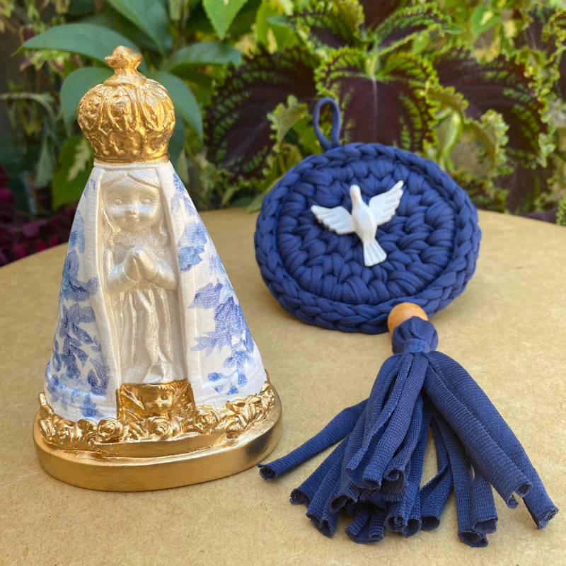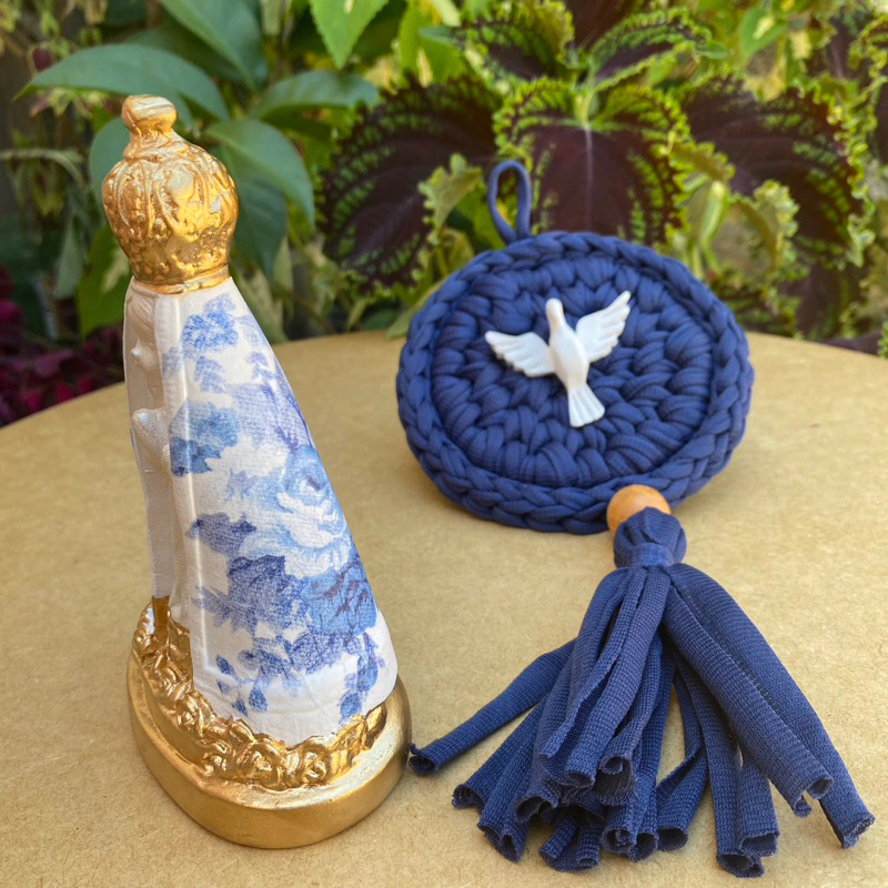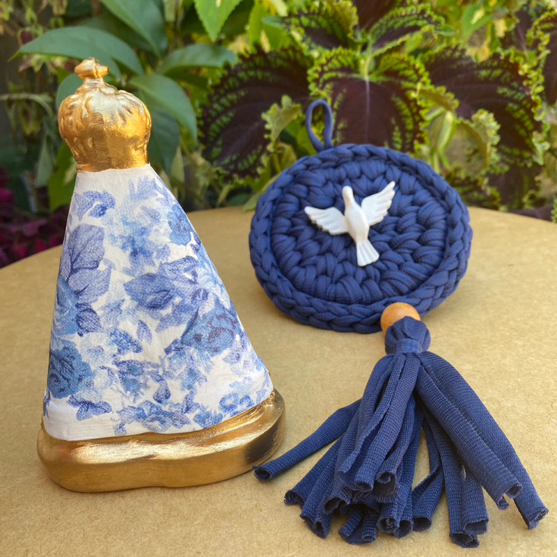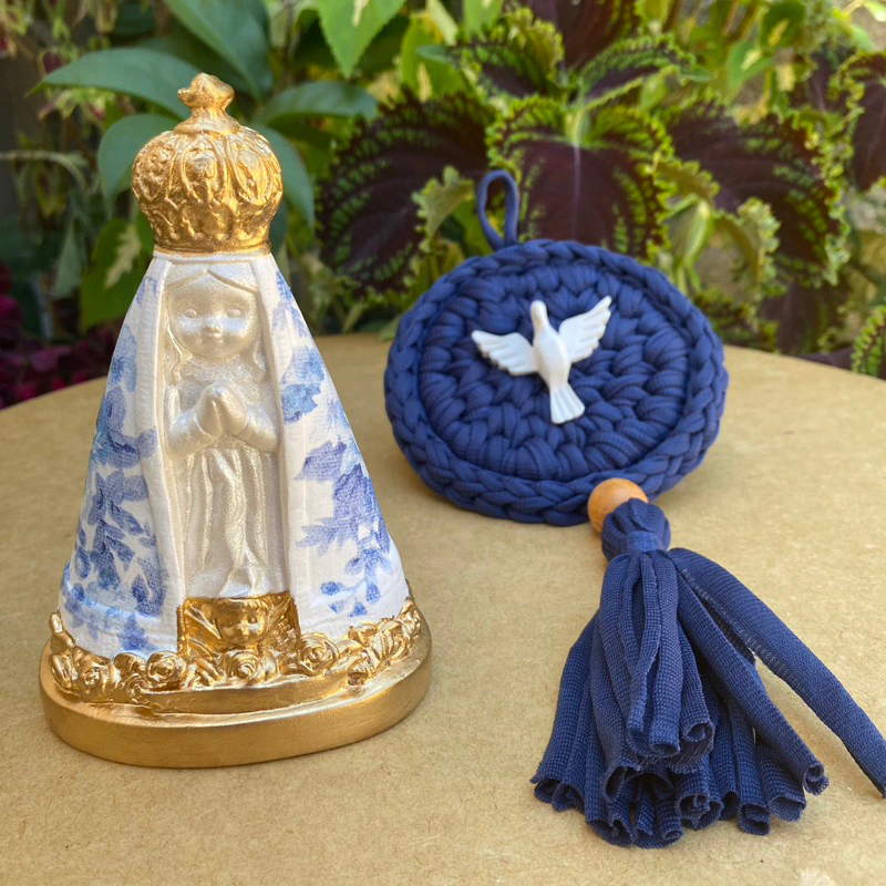 nossa senhora em gesso , trabalhada em decoupage azul , medindo 14cm de comprimento